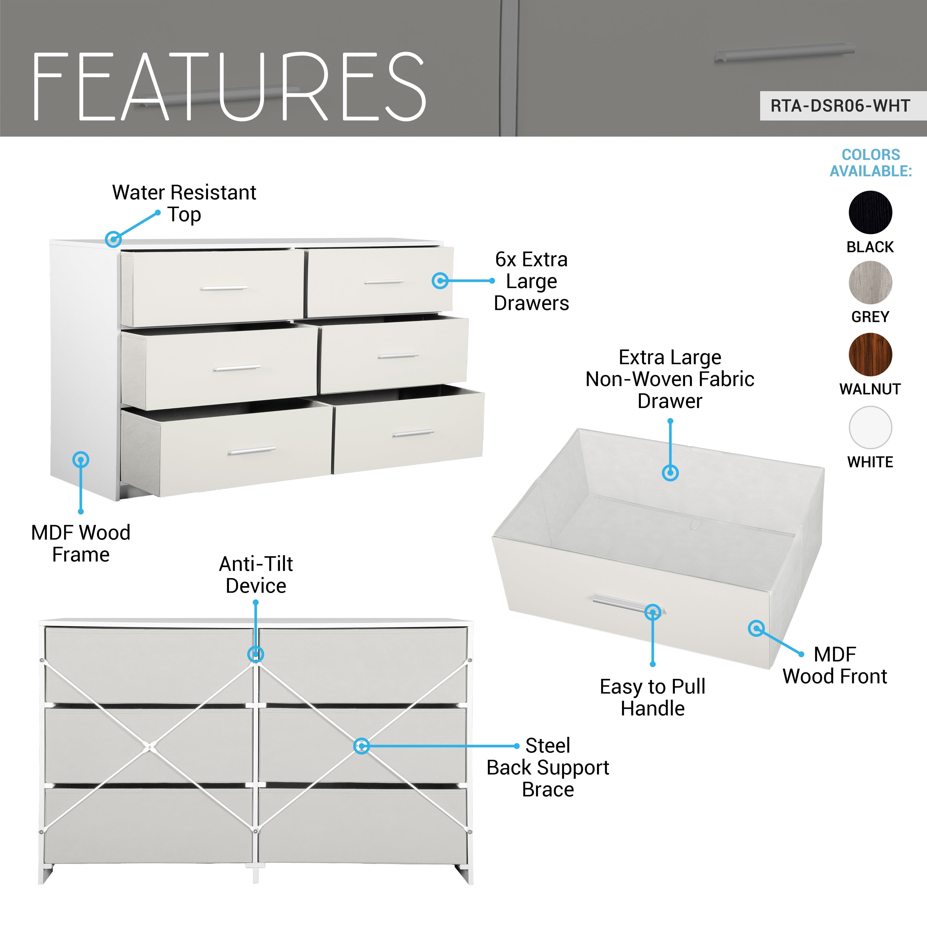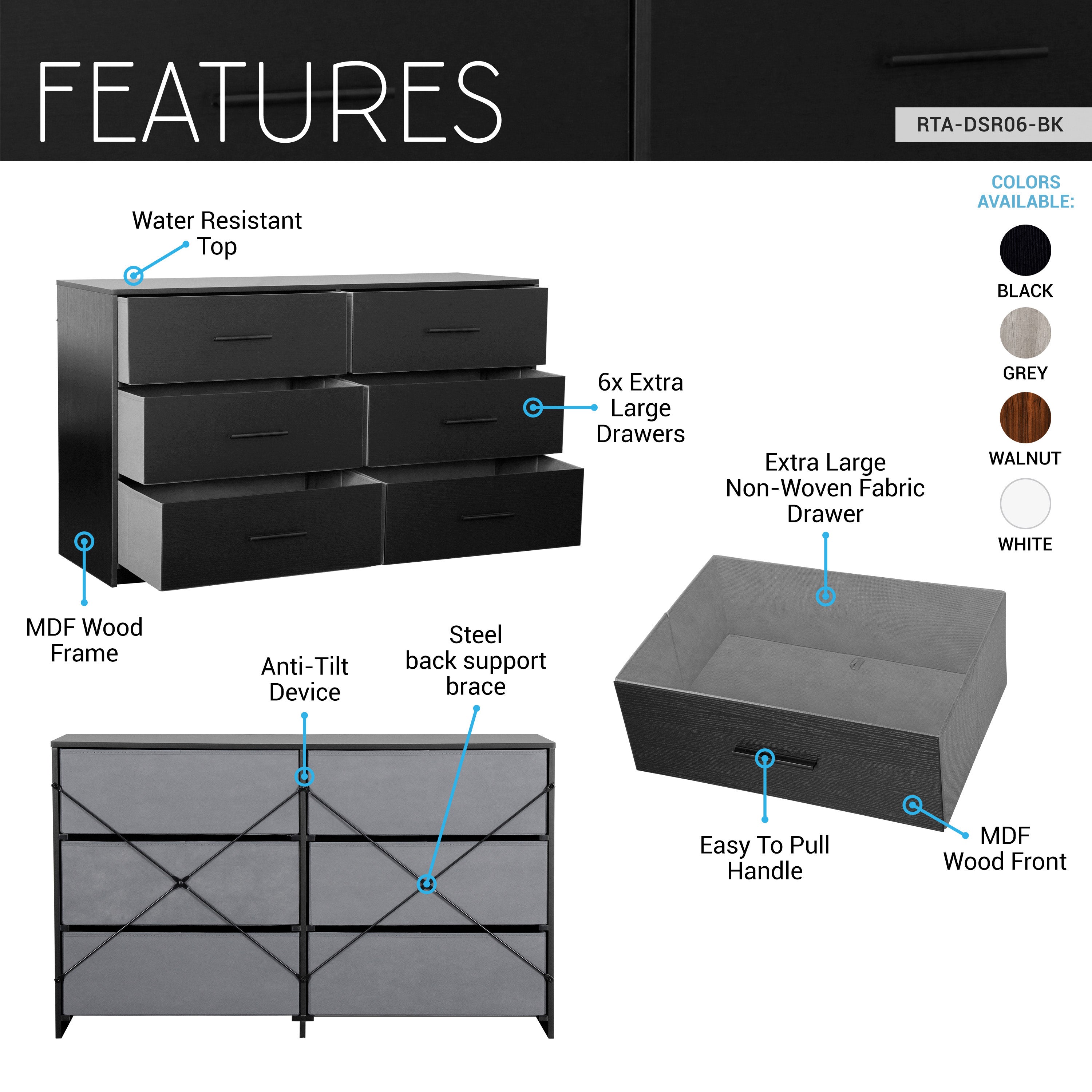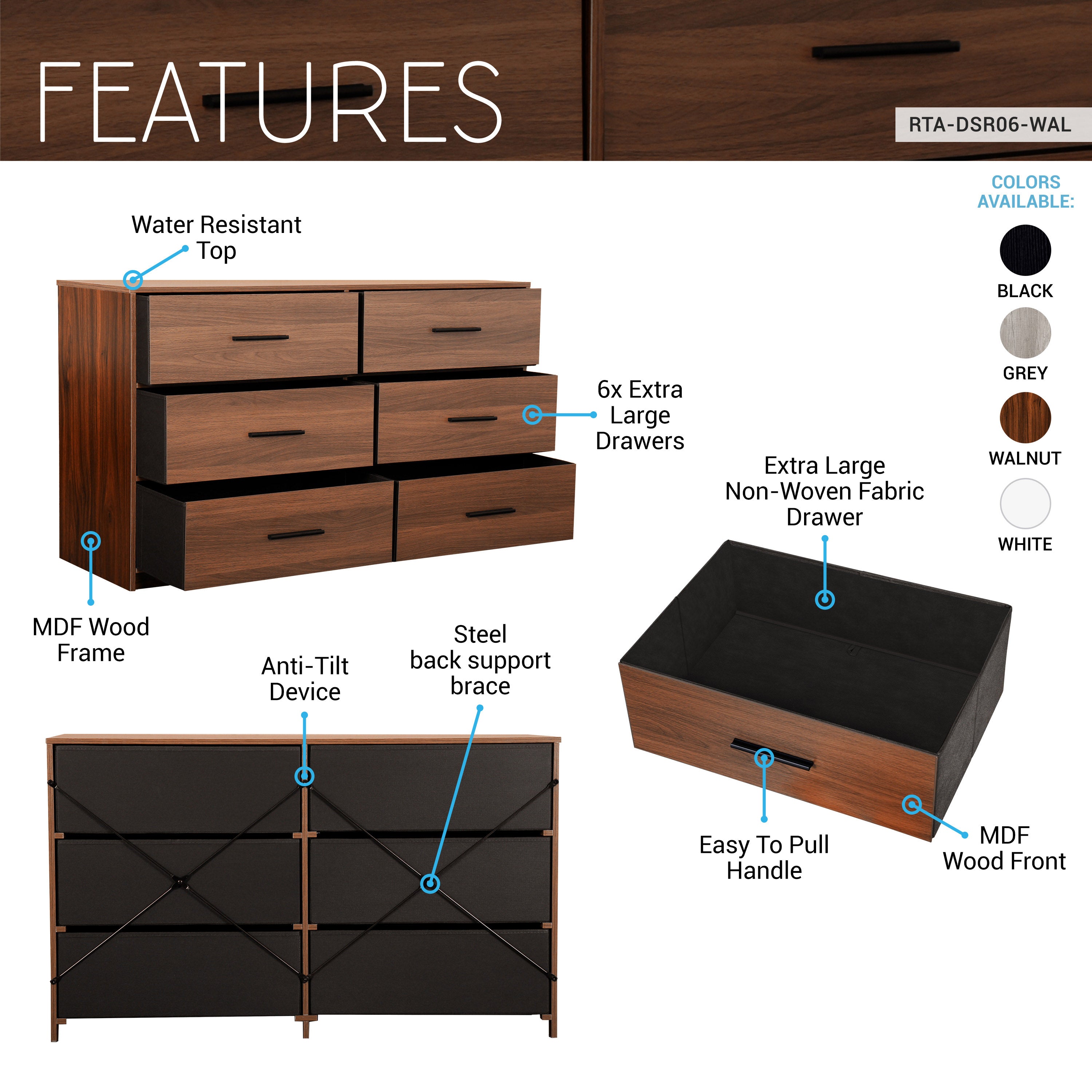 Our 6-Drawer Dresser is a premium storage solution designed to elevate your living space with both functionality and style. The dresser features six spacious fabric drawers, while the water-resistant top is perfect for showcasing decor, lamps, but also sturdy enough to double as a TV stand. Lightweight and easy to move, this dresser is ideal for small spaces such as dorms, apartments, or offices, without compromising on durability or elegance. Designed for long-lasting use with quality materials, it maintains its sophisticated appearance even with daily use. Whether in a bedroom, living area, or workspace, this dresser delivers premium storage with a touch of modern luxury. Colors: Black, Grey, Walnut, or Grey.