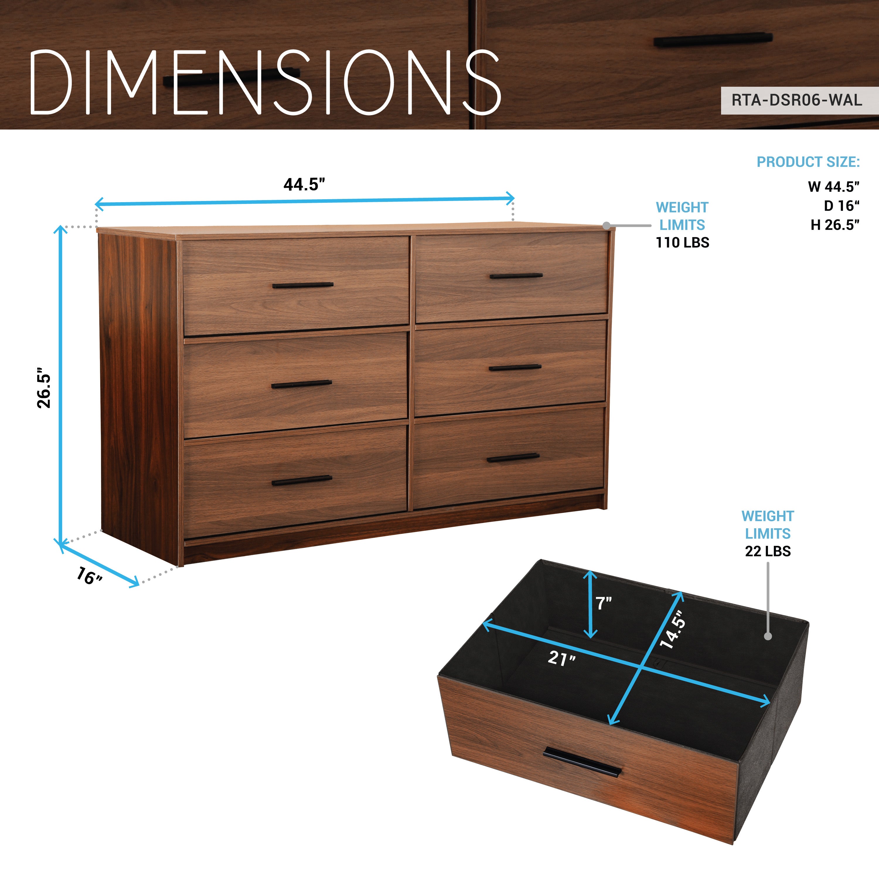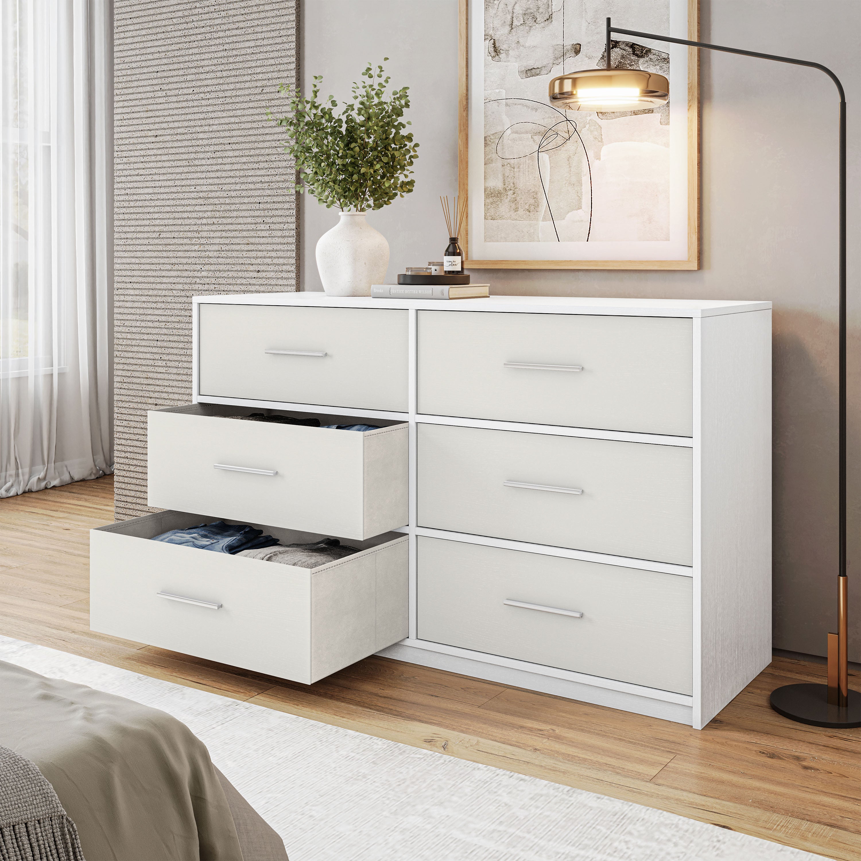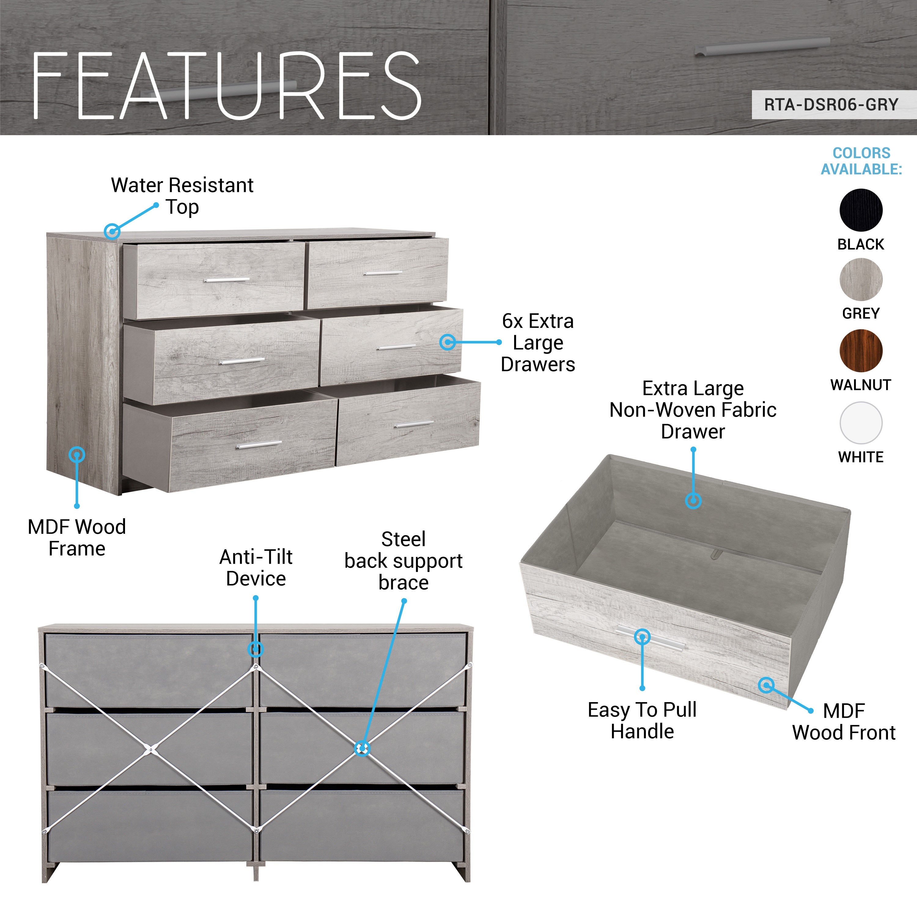 Our 6-Drawer Dresser is a premium storage solution designed to elevate your living space with both functionality and style. The dresser features six spacious fabric drawers, while the water-resistant top is perfect for showcasing decor, lamps, but also sturdy enough to double as a TV stand. Lightweight and easy to move, this dresser is ideal for small spaces such as dorms, apartments, or offices, without compromising on durability or elegance. Designed for long-lasting use with quality materials, it maintains its sophisticated appearance even with daily use. Whether in a bedroom, living area, or workspace, this dresser delivers premium storage with a touch of modern luxury. Colors: Black, Grey, Walnut, or Grey.