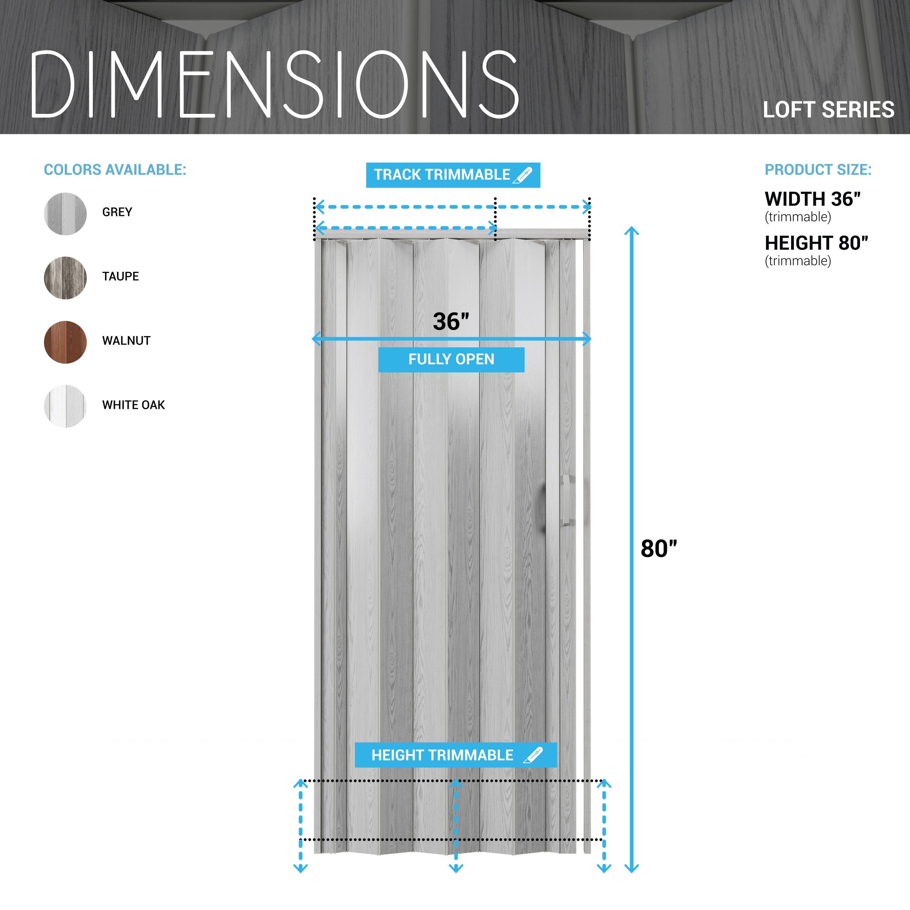 Our premium Loft Series double-walled accordion doors are crafted with durable double-walled, high-quality PVC for unmatched durability. The durable, maintenance-free vinyl panels have a scratch/UV-resistant coating that is easy to clean. Each package comes ready to install with all essentials including a track, hardware, door handle, and clear instructions. These robust foldable doors come in three standard widths and are trimmable to fit any door opening in your home or office. Ideal for any interior setting, our premium sliding accordion doors are space-saving and energy-efficient, elevating both the functionality and aesthetic of spaces such as living rooms, bedrooms, or any internal doorway. Colors: Taupe or White Oak.