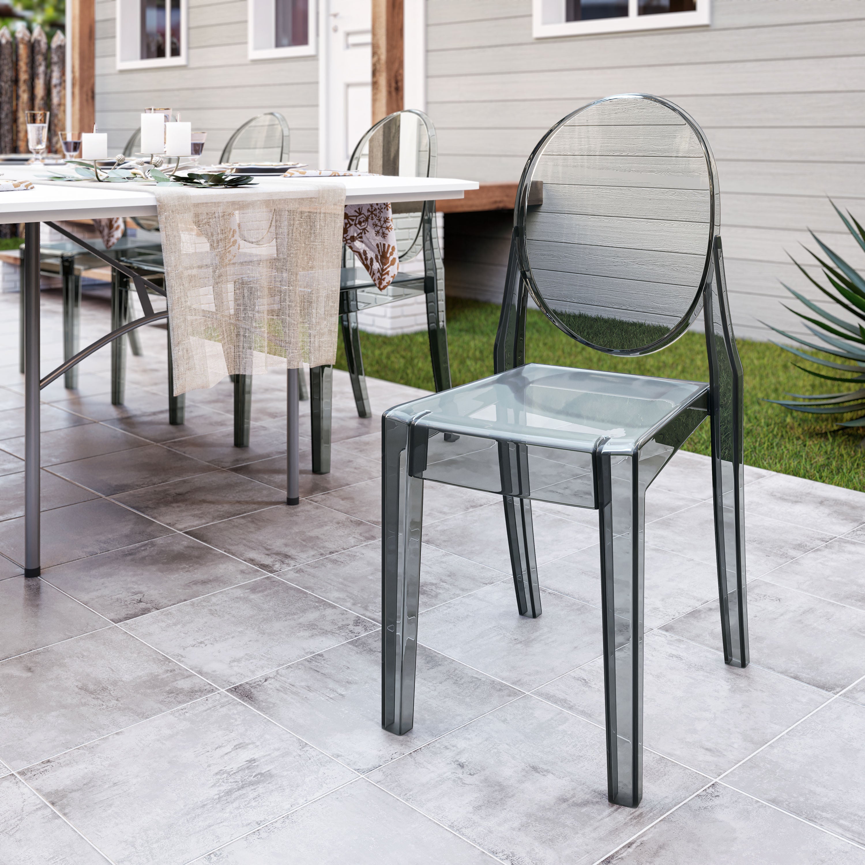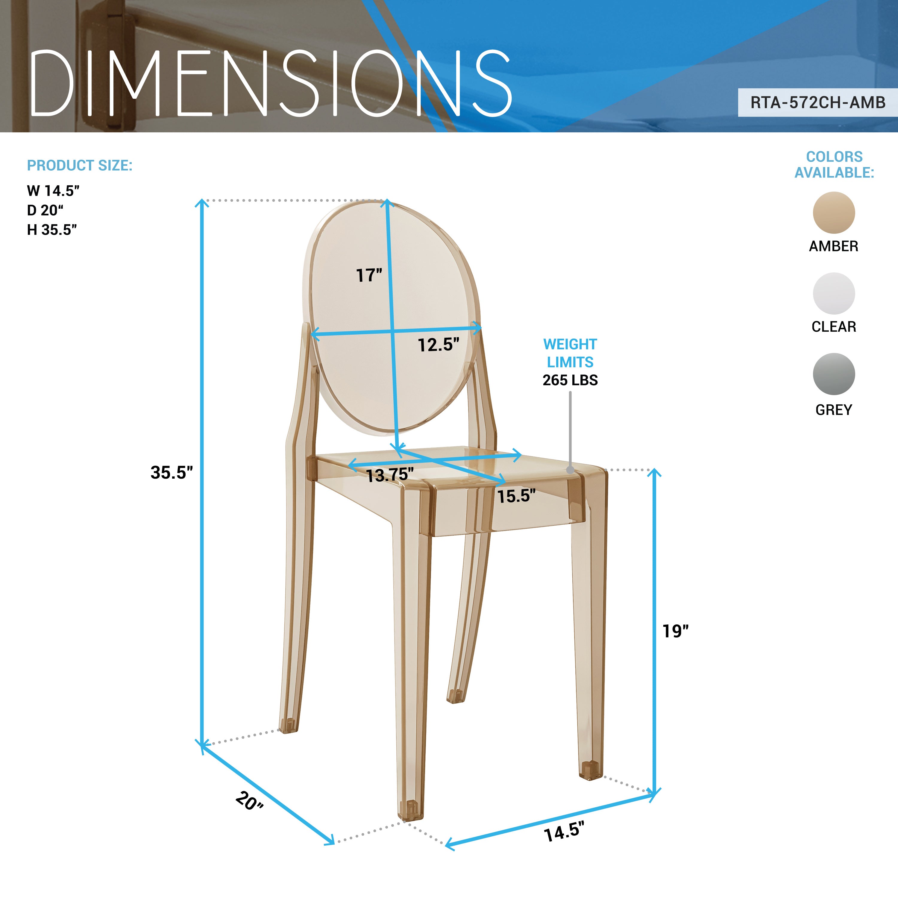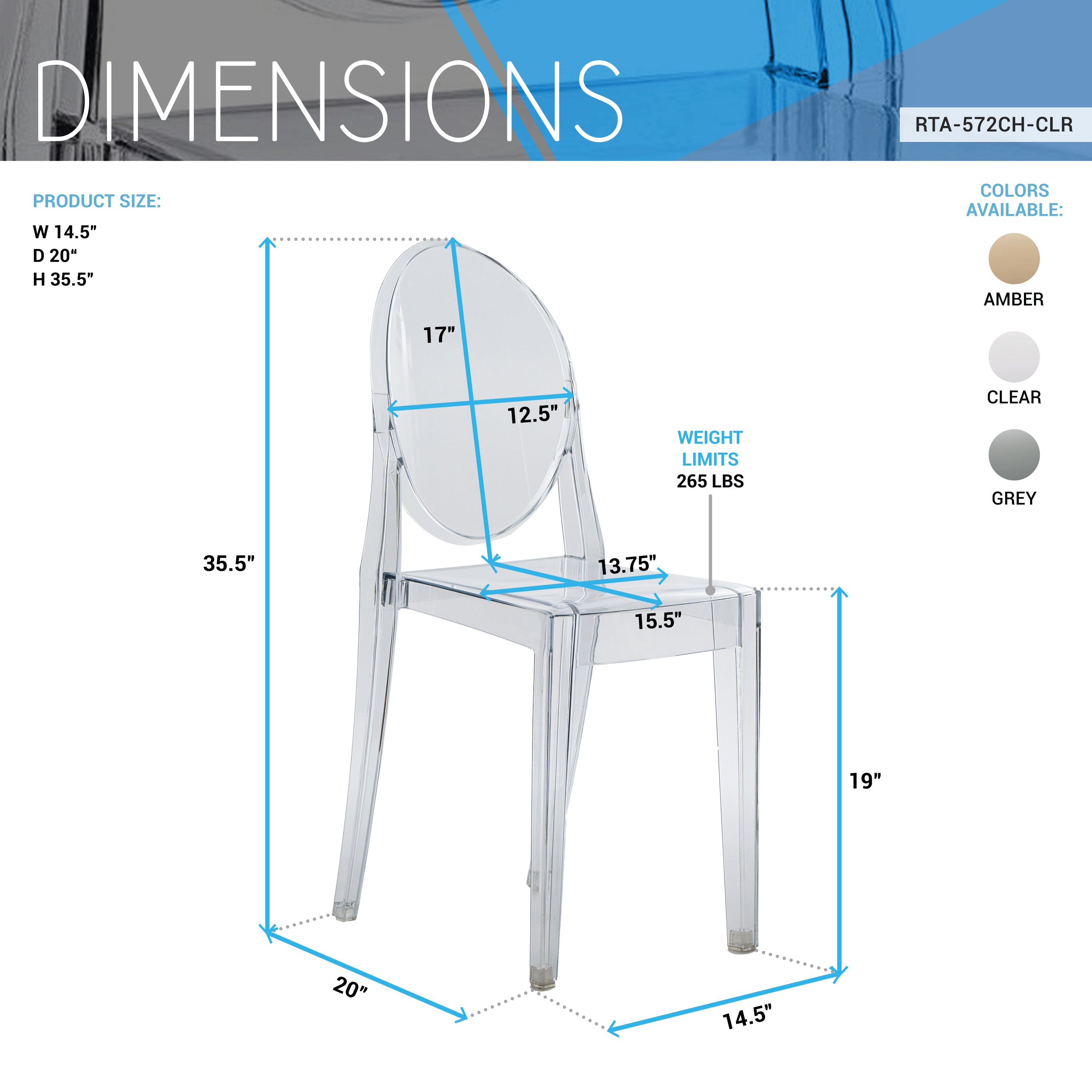 - Three Elegant Color Options: Available in three elegant color options; the classic transparent clear ghost chair, amber, or dark grey.