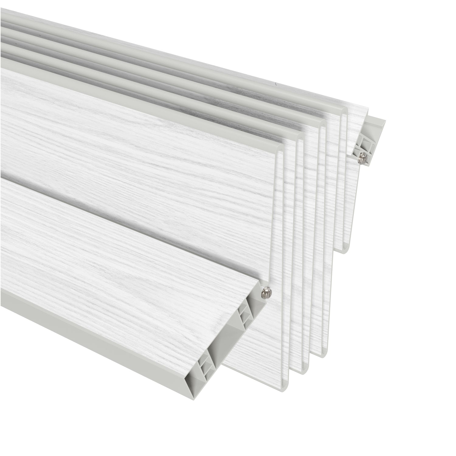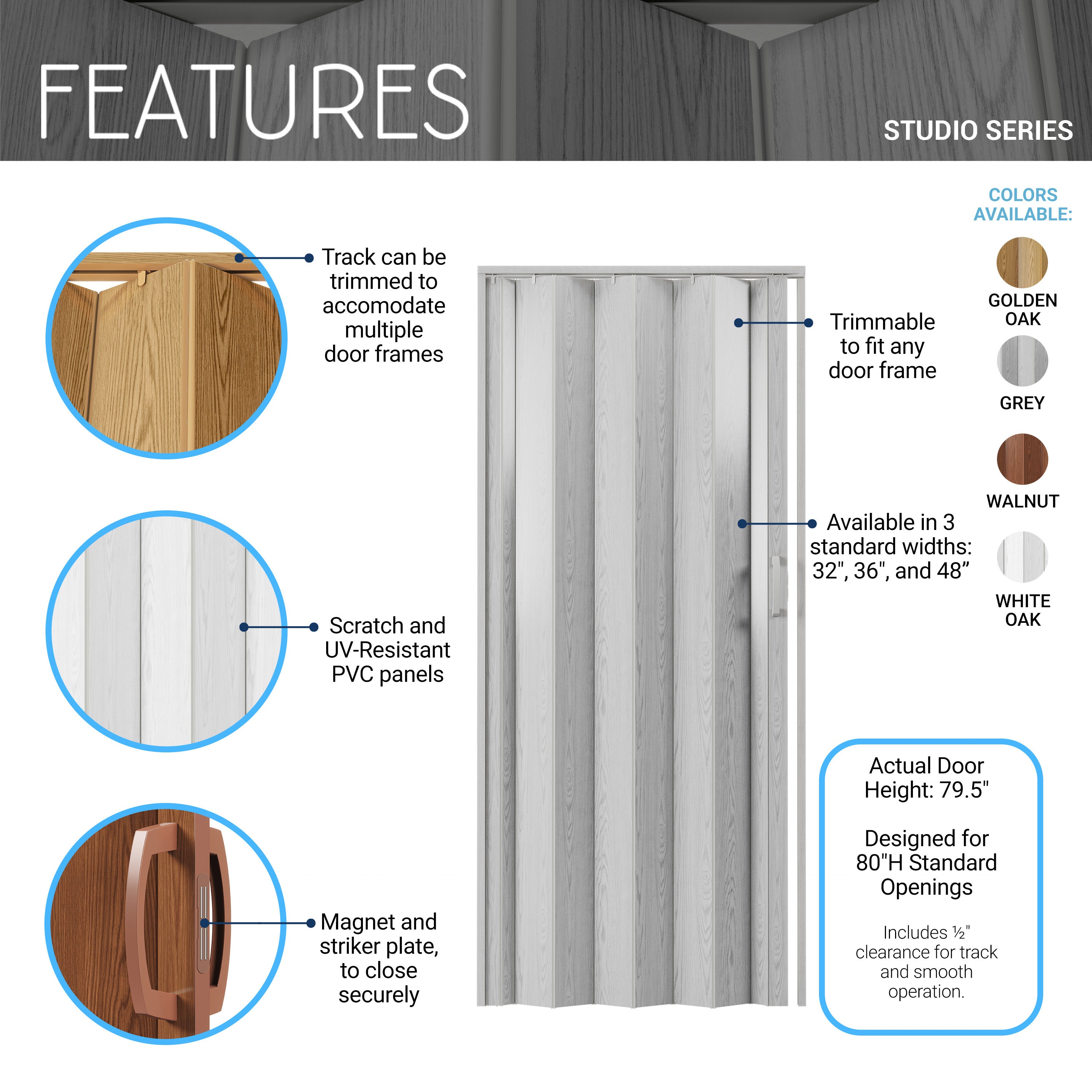 Our Studio Series accordion doors are crafted with high-quality PVC for unmatched durability. The durable, maintenance-free vinyl panels have a scratch/ UV-resistant coating that is easy to clean. Each package comes ready to install with all essentials including a track, hardware, door handle, and clear instructions. These robust foldable doors come in three standard widths and are trimmable to fit any door opening in your home or office. Ideal for any interior setting, our premium sliding accordion doors are space-saving and energy-efficient, elevating both the functionality and aesthetic of spaces such as living rooms, bedrooms, or any internal doorway. Colors: Walnut, White Oak, or Grey.
