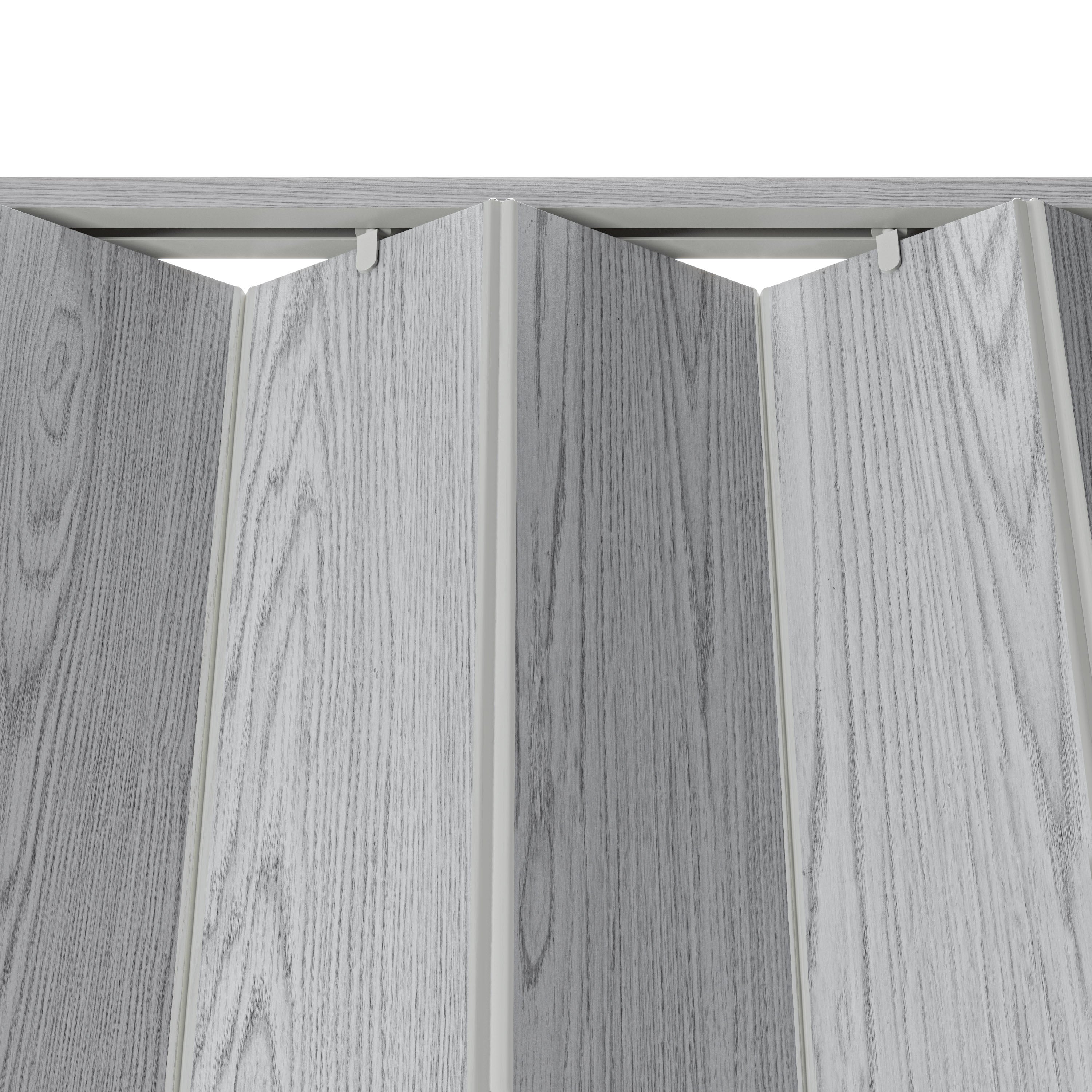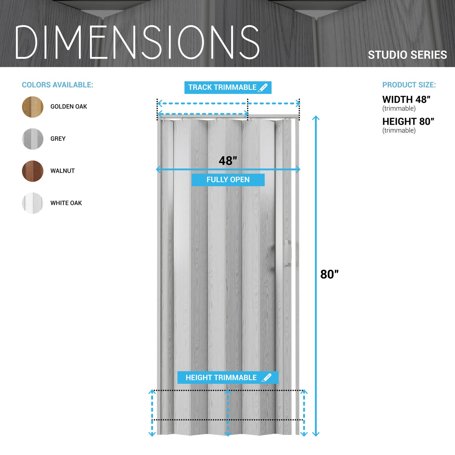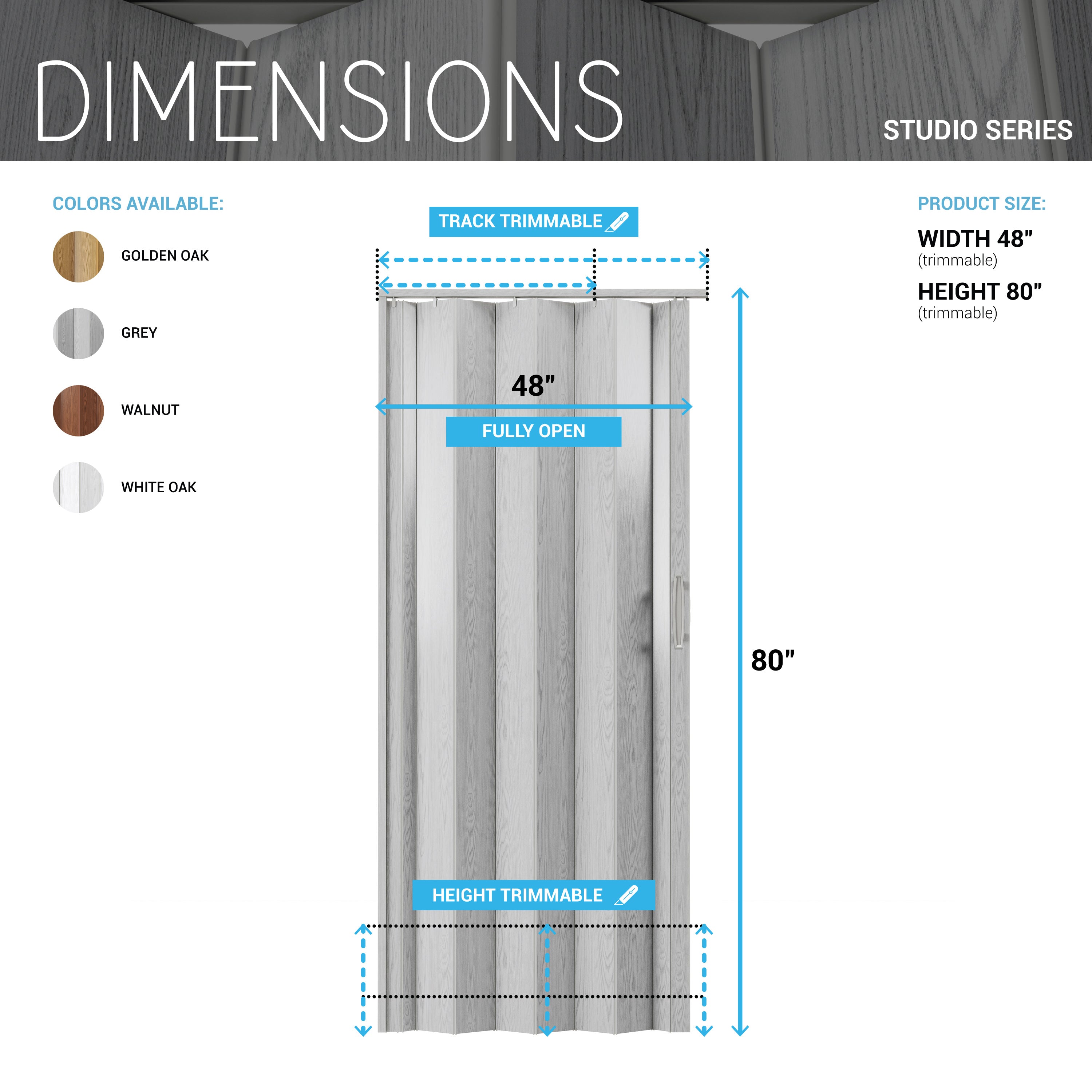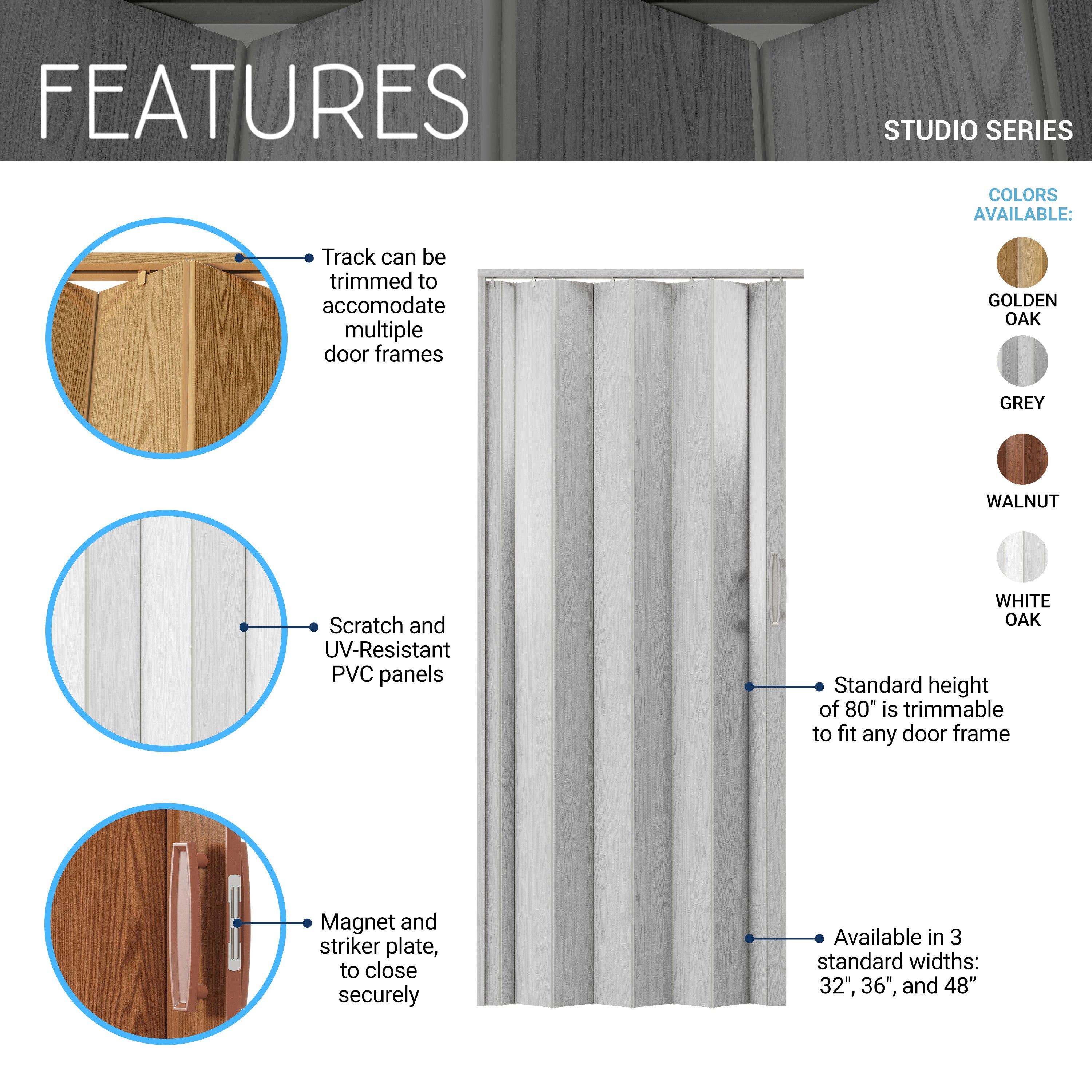 Our Studio Series accordion doors are crafted with high-quality PVC for unmatched durability. The durable, maintenance-free vinyl panels have a scratch/ UV-resistant coating that is easy to clean. Each package comes ready to install with all essentials including a track, hardware, door handle, and clear instructions. These robust foldable doors come in three standard widths and are trimmable to fit any door opening in your home or office. Ideal for any interior setting, our premium sliding accordion doors are space-saving and energy-efficient, elevating both the functionality and aesthetic of spaces such as living rooms, bedrooms, or any internal doorway. Colors: Golden Oak, Grey, White Oak or Walnut.